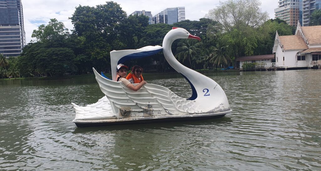 Pasamos toda la mañana explorando el parque y persiguiendo a los “lagartitos”. Incluso nos subimos a unas barquitas en forma de cisne que había en el lago, y para nuestra sorpresa, eran totalmente gratuitas. Fue una forma muy divertida y relajante de pasar el rato.