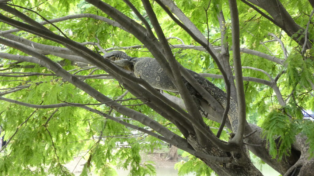 El parque es uno de los grandes pulmones verdes de la ciudad. Está rodeado de rascacielos, lo que crea un contraste precioso entre el bullicio urbano y la calma del lago central. Allí la gente sale a correr, a hacer yoga o simplemente a relajarse bajo la sombra de los árboles. Pero lo más sorprendente —y lo que realmente atrae a los curiosos— son sus varanos. Están por todas partes. Caminan entre los árboles, nadan en el lago y se pasean como si fueran los dueños del lugar. Lo más curioso es que los habitantes de Bangkok parecen convivir con ellos con total naturalidad… mientras que nosotros no podíamos evitar un ligero escalofrío cada vez que nos cruzábamos con uno.