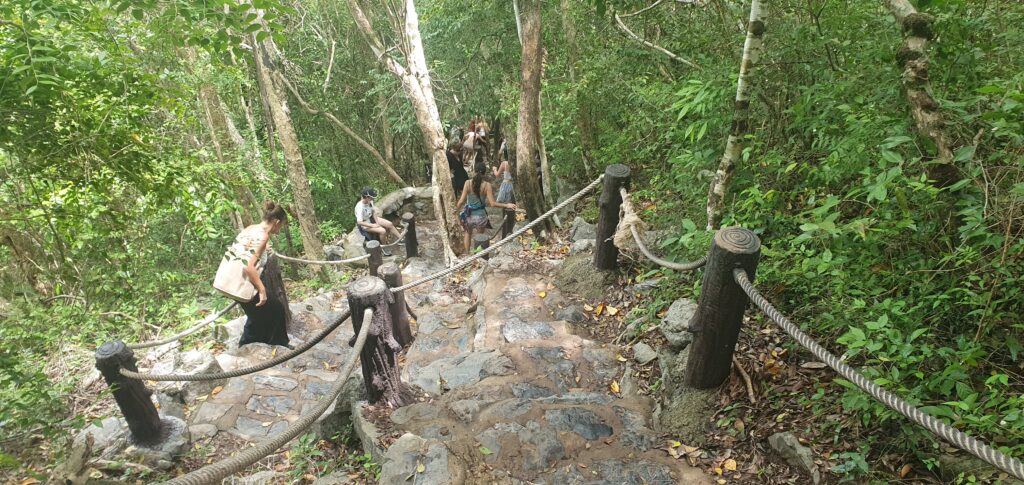 La subida no fue precisamente un paseo. El mirador más alto está a 500 metros sobre el nivel del mar, y el camino es corto pero muy empinado, con raíces, rocas y cuerdas que sirven de apoyo. Hay cinco puntos de descanso señalizados, pero con el calor y la humedad se hace realmente duro.