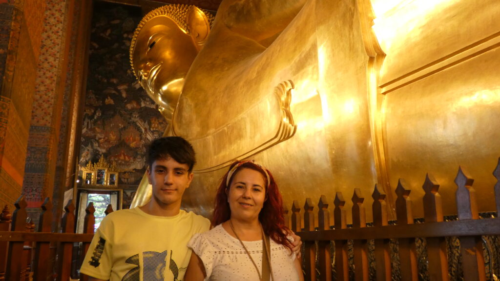Llegamos a primera hora y, para nuestra sorpresa, estábamos prácticamente solos. La entrada cuesta 300 baths por persona. El complejo es muy amplio, con una parte exterior llena de estupas doradas, jardines cuidados y varios edificios decorados hasta el último detalle. Pero, sin duda, el protagonista absoluto es el edificio que alberga al gran Buda reclinado, una estatua impresionante de 46 metros de largo y 15 metros de alto, completamente recubierta de pan de oro, que representa al Buda entrando en el nirvana. ¡Es una auténtica pasada verlo tan de cerca! Y consejo práctico: llevad calcetines si no queréis achicharraros los pies al quitaros los zapatos para entrar.
