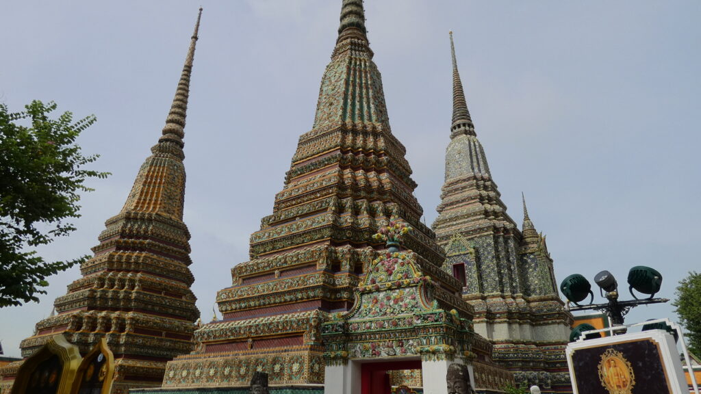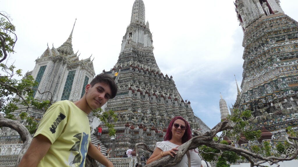 Aunque lo ideal es visitarlo al atardecer (como su nombre indica), a nosotros nos venía bien hacerlo en ese momento, aunque ya eran casi las 13:00 h y el calor era… brutal. La entrada cuesta 200 baths por persona e incluye una botella de agua (aunque más que refrescarnos, parecía sopa caliente). El templo está compuesto por varias estupas decoradas con mosaicos hechos con cerámica china de colores, resultado del comercio marítimo que llegaba antiguamente al puerto de Bangkok. Al sol brillan como si estuvieran bordadas.