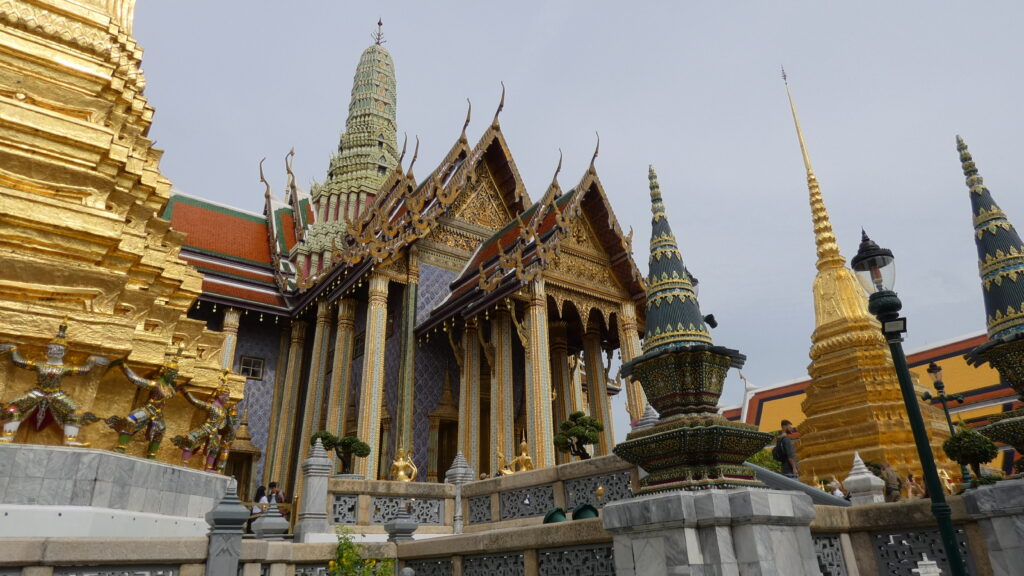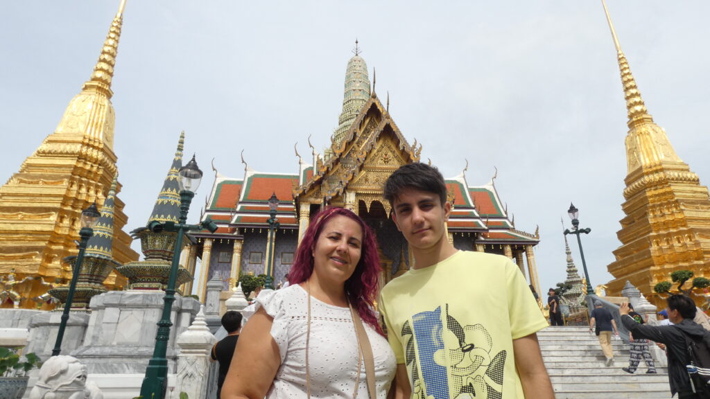 Nosotros ya habíamos estado hace 16 años, pero volver sigue siendo impresionante. El edificio más importante del recinto es el que alberga al Buda Esmeralda, considerado la imagen budista más venerada de todo el país. Esta pequeña estatua (de apenas 66 cm de alto) está tallada en jade —aunque durante siglos se creyó que era esmeralda— y vestida con túnicas de oro que cambian según la estación del año. La tradición de cambiarle la túnica se remonta al rey Rama I y sigue siendo un acto religioso clave en el calendario tailandés.