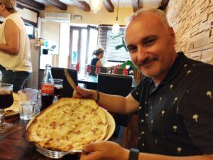También probamos la tarte flambée, una especie de pizza muy fina con nata, cebolla y bacon, ¡deliciosa!