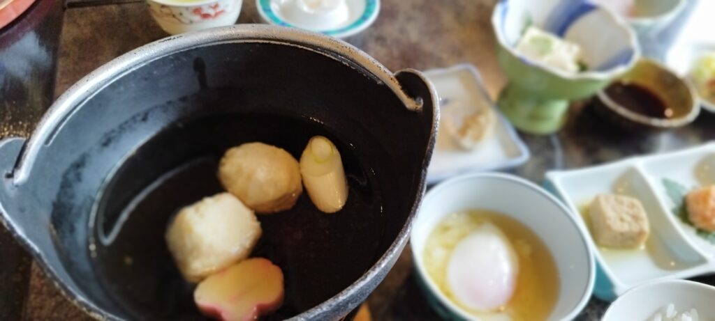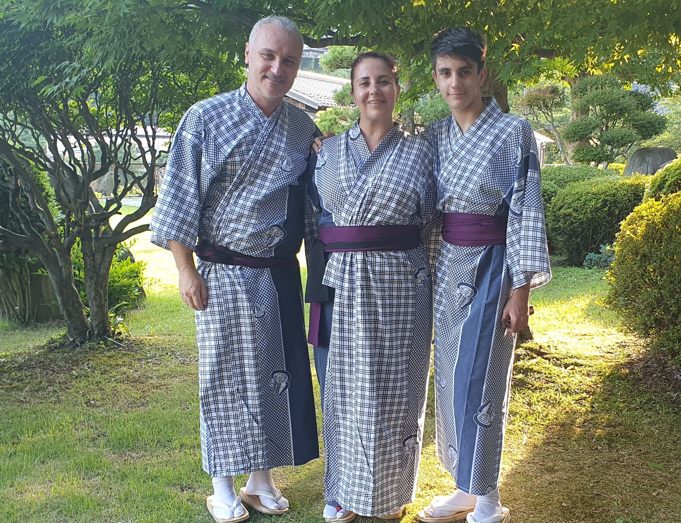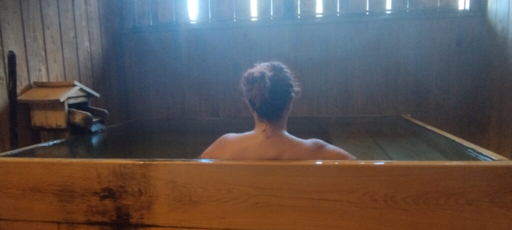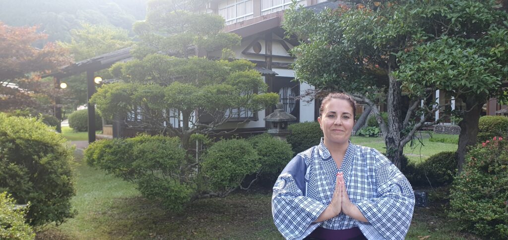 Subimos a la habitación, que ya estaba preparada, nos colocamos los yukata (esas batas tradicionales de algodón que te dejan en los ryokan) y nos fuimos al onsen. Era muy bonito, todo de madera, con un toque rústico y tradicional, pero había un pequeño detalle que no habíamos tenido en cuenta… ¡era julio y hacía un calor infernal! Y claro, el agua del onsen, que está casi hirviendo, no ayudaba mucho. Aguantamos como valientes un par de minutos, solo por decir que lo habíamos probado, pero salimos sudando como si hubiéramos estado en una sauna. Eso sí, nos reímos un montón y nos quedó la anécdota.