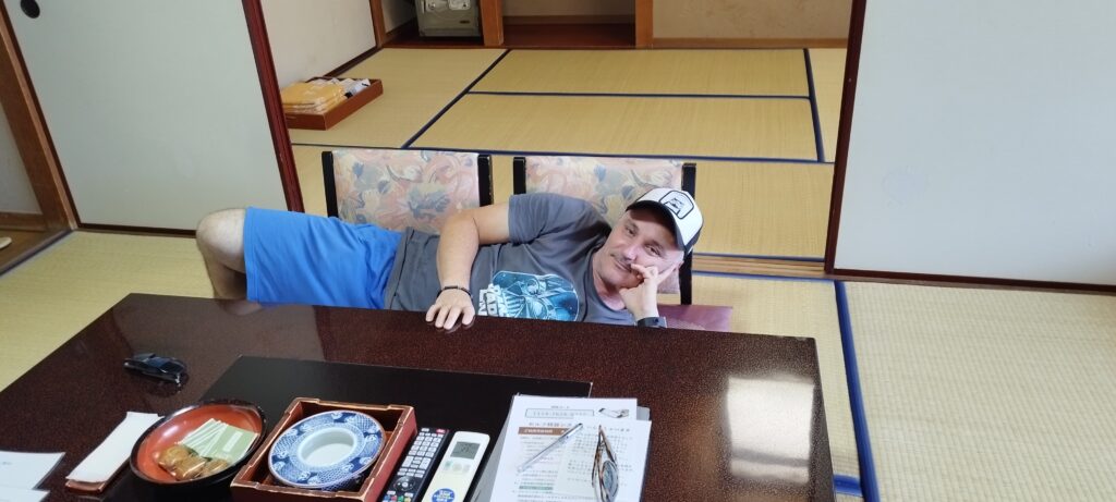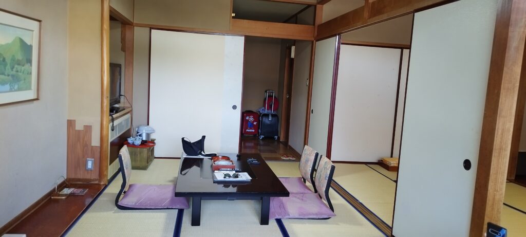 La habitación era toda una experiencia en sí misma: al entrar había un espacio para dejar los zapatos, un baño con una mini bañera, el inevitable váter japonés con más botones que una nave espacial, y luego dos estancias. Una tipo salón con mesa bajita y sillas sin patas para sentarse en el suelo, y otra zona con tatami donde nos colocaron los futones para dormir.