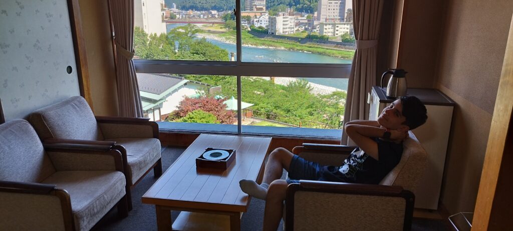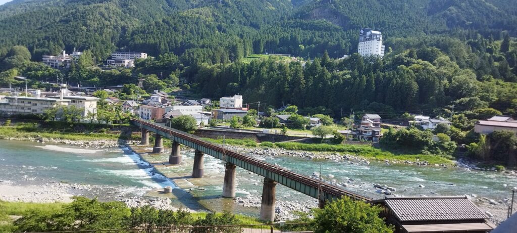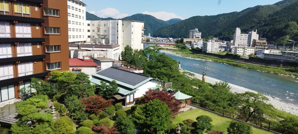 Estábamos justo frente al río Hida, cuyas aguas bajaban con fuerza, cristalinas y llenas de vida. Un puente de hierro lo cruzaba, dándole un aire de película antigua japonesa, y más allá se extendía el pueblecito, con sus casas de madera y tejados oscuros, todo rodeado de un mar de montañas verdes que se perdían en el horizonte. Nos quedamos embobados mirando por la ventana, sin decir nada, solo escuchando el sonido del río y dejando que la calma nos envolviera. Fue uno de esos momentos mágicos que solo se viven viajando.