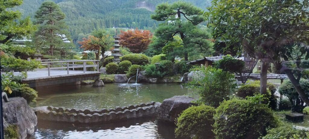 Con los yukata puestos y el calor todavía en el cuerpo, salimos a dar un paseo por el precioso jardín japonés del hotel. Un lugar lleno de armonía y detalles: un pequeño estanque con peces, una fuente de piedra que sonaba como un susurro, árboles perfectamente podados y un puente de madera que cruzaba el agua. Todo rodeado por el verde intenso de las montañas. Era como caminar dentro de una postal.