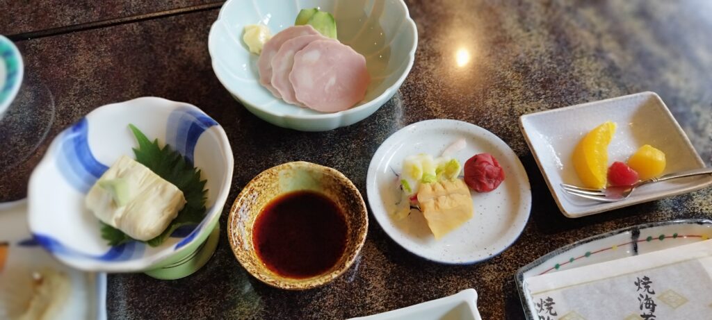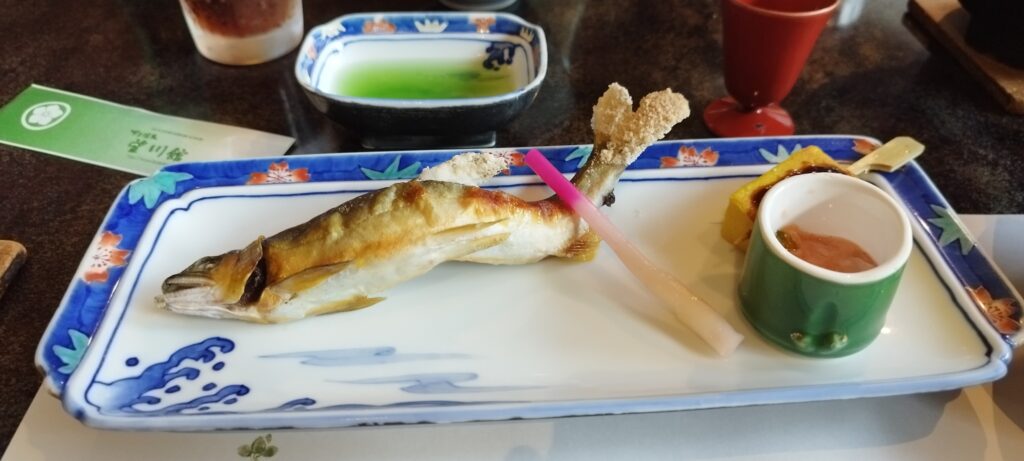 A las seis en punto bajamos a cenar. No teníamos mucha hambre, pero la experiencia lo merecía. La cena fue impresionante: una bandeja enorme llena de pequeños platillos delicadamente presentados. Pescado, carne de Hida, verduras, cosas que no sabíamos identificar… A Emi y a Samuel no les convenció mucho, pero a mí me encantó. Más allá de los sabores, la experiencia fue preciosa. Cuidaban cada detalle y todo se hacía con calma y respeto.