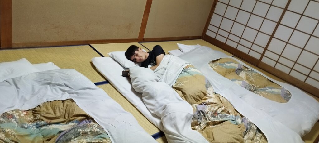 Después de cenar subimos directamente a la habitación. Tocaba probar los famosos futones. Sinceramente… no dormimos muy bien. La experiencia fue curiosa, pero no repetiremos, ¡al menos no por gusto! 😂