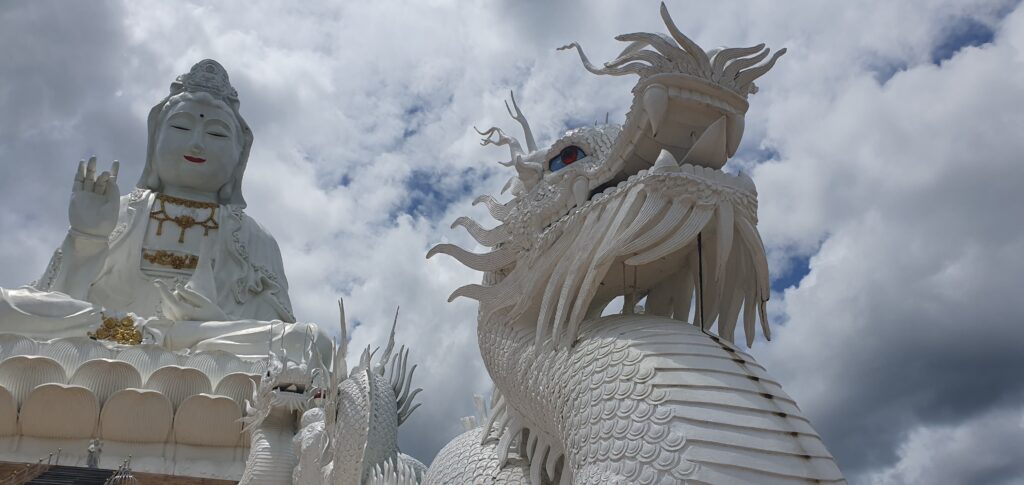 La gran protagonista es la impresionante estatua de Guan Yin, la diosa de la misericordia, con 70 metros de altura. Es tan gigantesca que se ve desde muchísimos puntos de Chiang Rai y, una vez allí, impone de verdad. Se puede subir en ascensor por el interior de la estatua hasta la altura de la frente, desde donde se obtienen vistas panorámicas espectaculares de los alrededores.