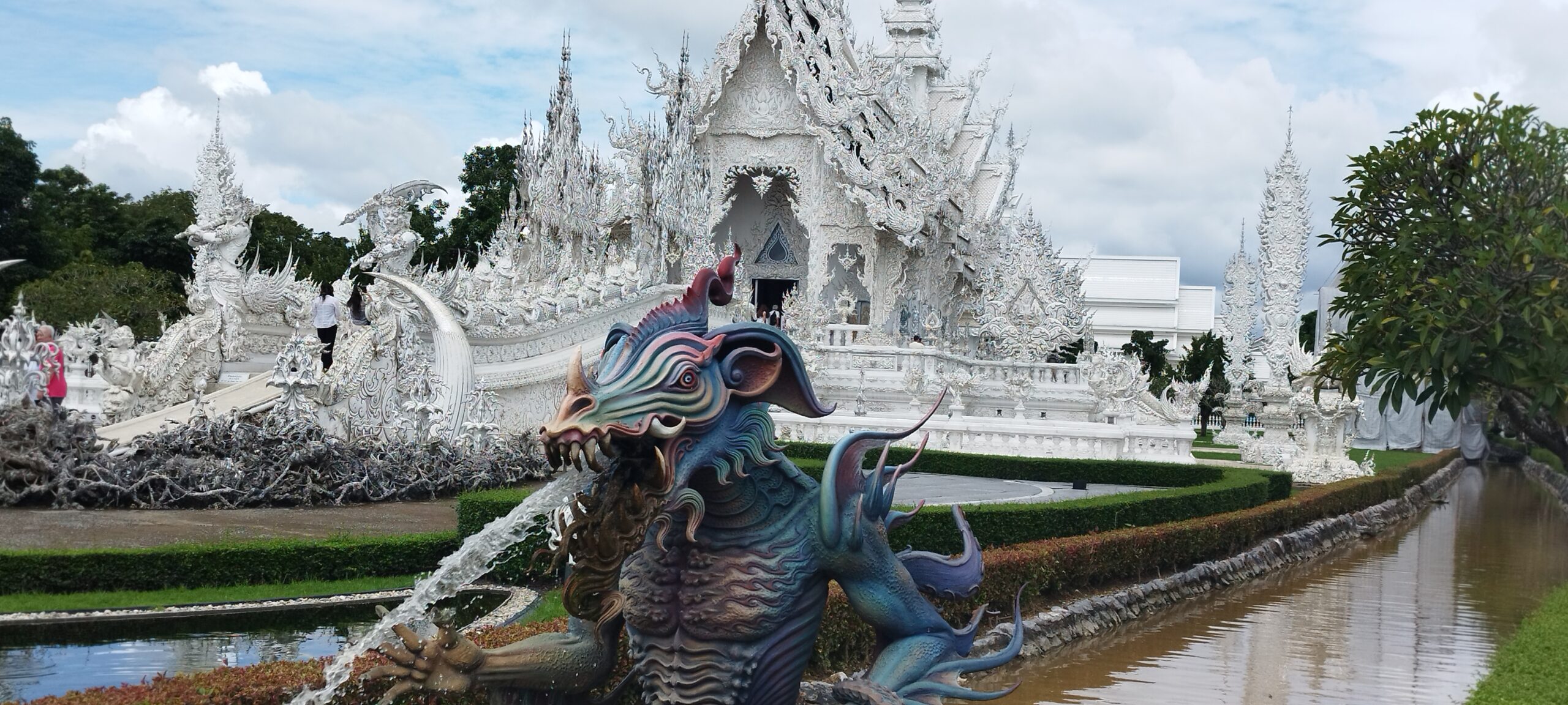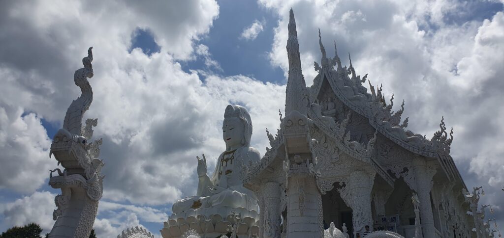 Lo que lo hace tan especial es precisamente eso: no se parece a ningún otro templo de Tailandia. Todo es blanco, cubierto de pequeños espejos que brillan con la luz del sol y simbolizan la pureza y la sabiduría de Buda. El famoso puente de las manos que emergen del suelo representa el sufrimiento, el deseo y el infierno que hay que dejar atrás antes de alcanzar la iluminación.