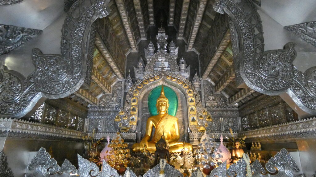 Descripción: Su edificio principal está completamente recubierto de plata tallada, tanto por fuera como por dentro. No se permite la entrada a mujeres en el ubosot (salón principal) por normas tradicionales, pero se puede visitar el recinto y tomar fotos.