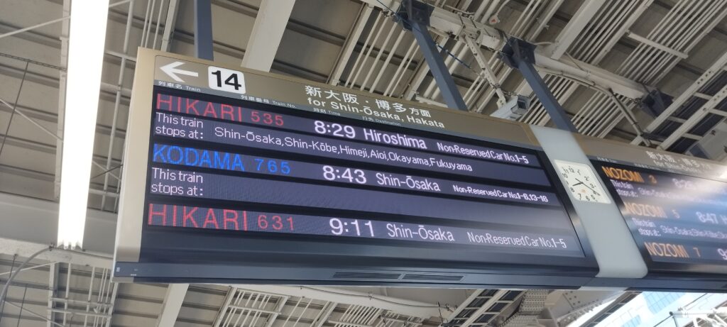 Subimos a un tren bala (shinkansen) con destino a Hiroshima. El trayecto duró aproximadamente una hora y 45 minutos, y desde allí tomamos un tren local de la línea JR Sanyo hasta la estación de Miyajimaguchi, en un trayecto de unos 25 minutos.