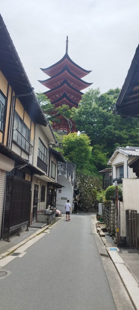 Después subimos a una colina donde se alza una elegante pagoda de cinco pisos junto a un gran pabellón. Desde allí se tienen vistas muy bonitas de la isla. Más tarde descendimos hacia la zona comercial de Miyajima, repleta de tiendas de souvenirs, artesanía local y especialidades gastronómicas. Durante el paseo seguimos cruzándonos con los simpáticos ciervos.