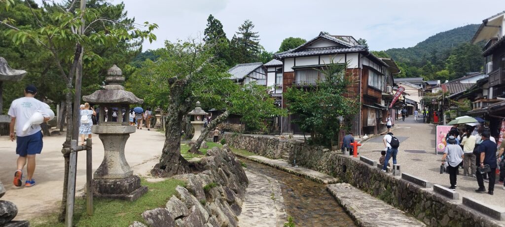 Tras la comida, seguimos caminando hasta llegar a una zona más tranquila de la isla, con casas tradicionales, un pequeño canal y otro templo. Allí vimos a gente refrescándose los pies en el agua, y también a ciervos bebiendo. Fue, sin duda, la parte más bonita y serena de Miyajima.