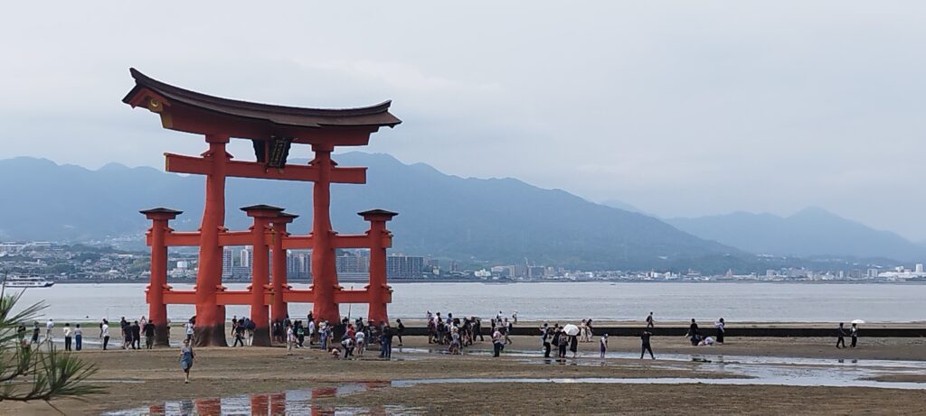 Aunque es cierto que la imagen más icónica del torii es con marea alta, cuando parece flotar sobre el agua, nos pareció igualmente impresionante verlo tan de cerca. Muy cerca del torii se encuentra el santuario de Itsukushima, de un rojo intenso y construido sobre pilotes. No entramos porque a esas alturas del viaje ya llevábamos una buena dosis de templos, pero lo contemplamos desde fuera y nos pareció precioso.