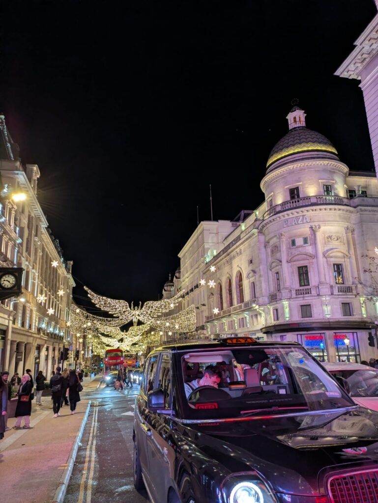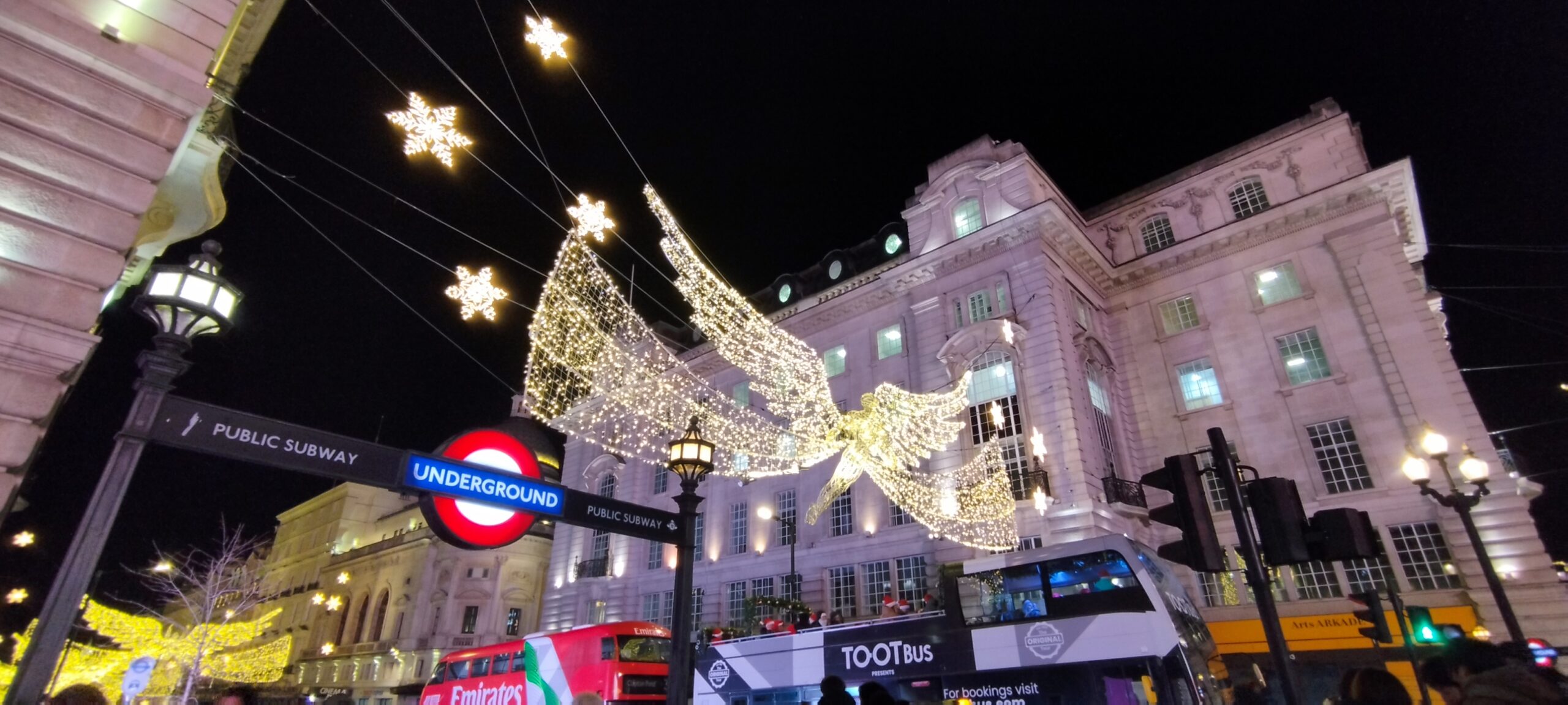 En Piccadilly miramos embobadas las pantallas gigantes, pero lo mejor vino al entrar en Regent Street: los ángeles luminosos suspendidos sobre la calle son, sin exagerar, de las decoraciones más bonitas de Londres.