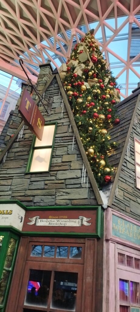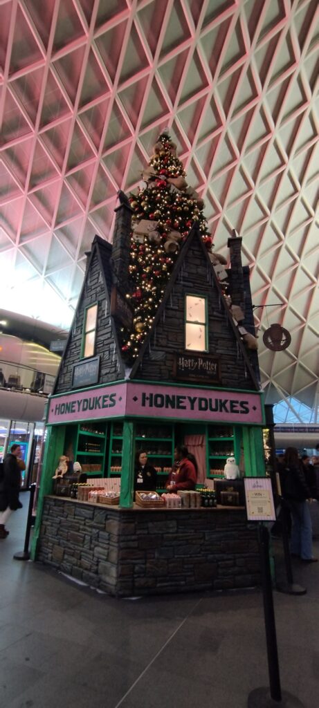 La cola era kilométrica, así que decidimos no esperar… pero entramos en la tienda oficial, llena de merchandising y decorada con un árbol de Navidad temático. Ideal para fans, aunque confieso: el “andén” nos decepcionó un poco, pero la estación en sí es una joya.