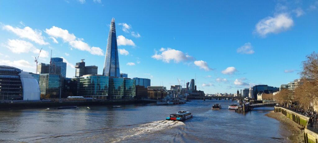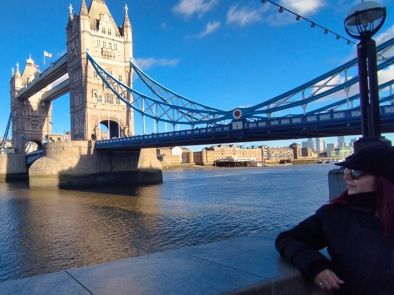 Desde la otra orilla del río, cruzando el Tower Bridge, sacamos algunas de las mejores fotos del viaje. Además, junto al río había un mercadillo navideño con vistas espectaculares: puente iluminado, rascacielos al fondo, y una atmósfera tranquila y navideña.