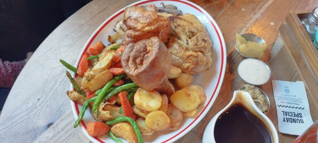 Era domingo y queríamos cumplir la tradición inglesa: un buen Sunday Roast. Encontramos mesa en el pub Tower Bridge Arms. Pedimos un plato para compartir que llevaba: