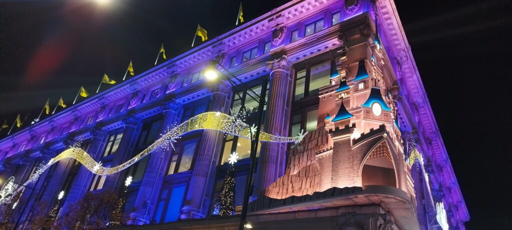 Al salir visitamos los escaparates de Selfridges, este año decorados con escenas de películas Disney y un enorme castillo en la fachada. Las tiendas y hoteles de la zona estaban llenos de luces, ambiente navideño y lujos.
