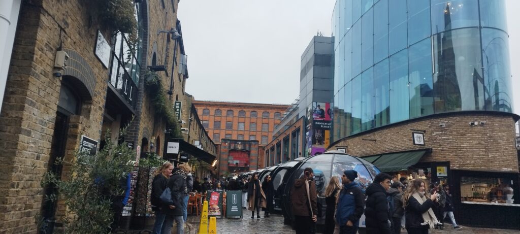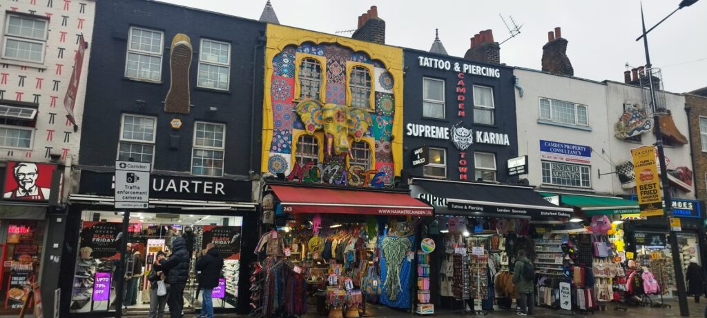 Caminamos sus calles con fachadas estrafalarias, tiendas vintage, puestos de música, bullicio, y mucho carácter. El Camden Market es una experiencia: un laberinto de pasajes con decenas de puestos de comida callejera, artesanía y ropa alternativa.