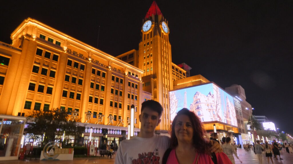 Fuimos en metro, que nos costó 3 yuanes por persona, y recorrimos la avenida con calma. Hay de todo: una enorme Apple Store, tiendas de Huawei con coches expuestos y centros comerciales gigantescos que llaman mucho la atención.