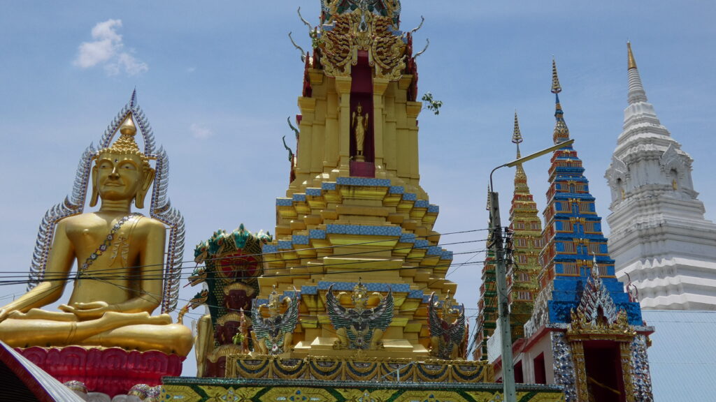 Como aún faltaba tiempo para poder entrar en la habitación, decidimos aprovechar para visitar un templo que quedaba algo lejos del resto de nuestras rutas: el Wat Paknam Phasi Charoen, al oeste de la ciudad, famoso por su gran Buda dorado junto al canal. Cogimos el BTS hasta allí.