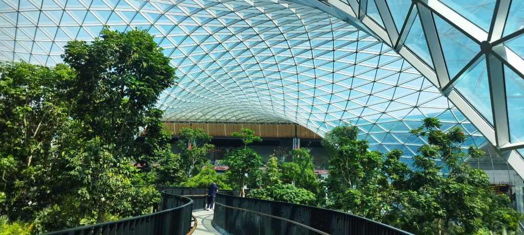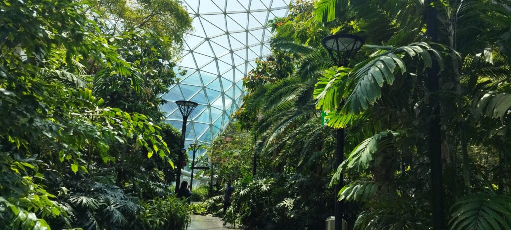 Jardín tropical interior con árboles reales bajo una gran cubierta acristalada.