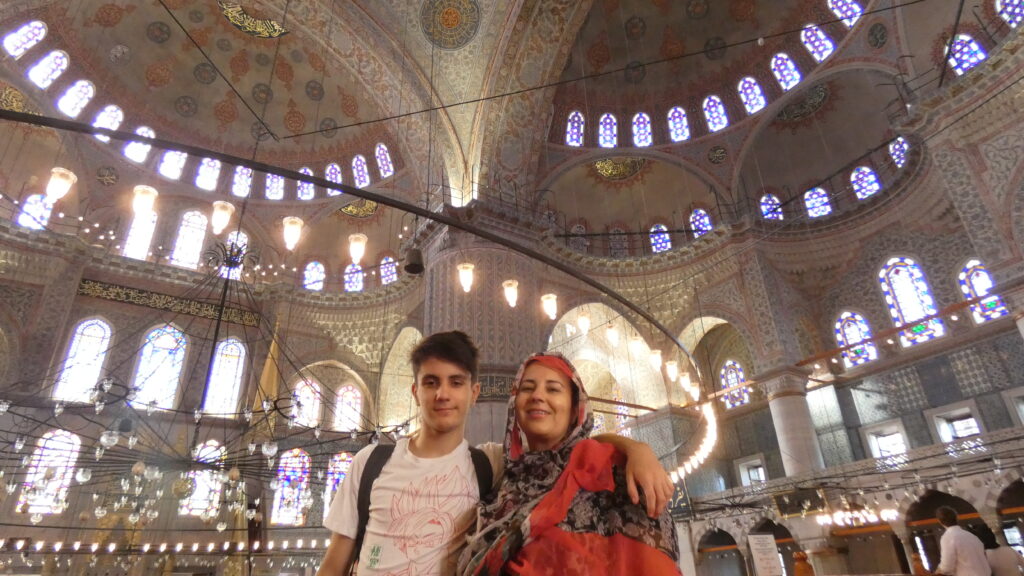 Nuestra primera parada fue la Mezquita Azul, ya que la noche anterior no habíamos podido entrar. Llegamos pronto, así que fuimos de las primeras personas en acceder cuando abrió, a las 8:30 de la mañana (aunque los horarios pueden variar según el día o la oración, lo ideal es consultarlos antes de ir). La entrada es gratuita, pero hay que cumplir unas normas de vestimenta: hombros y rodillas cubiertos, y las mujeres deben llevar la cabeza tapada. Yo, que soy previsora, llevé mi propio pareo, pero si no llevas, te prestan uno allí mismo. También hay que descalzarse antes de entrar.