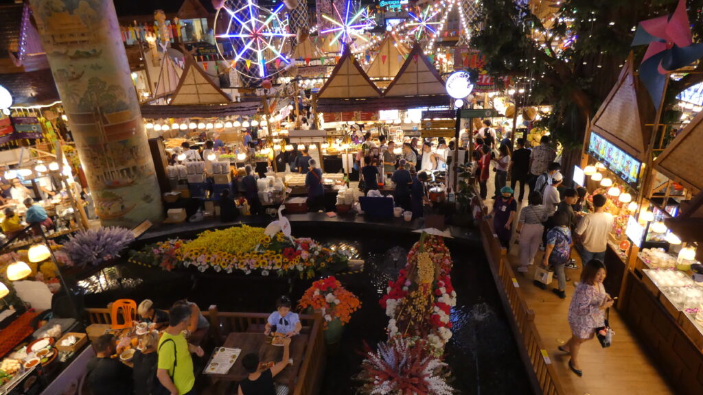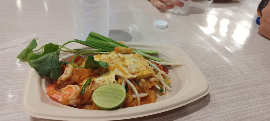 Este food court está decorado como si fuera un mercado callejero, con un ambientazo, música en directo y hasta un «mercado flotante» en miniatura. Teníamos un hambre tremenda, así que nos lanzamos a por nuestro primer Pad Thai del viaje, ese plato tailandés hecho con fideos de arroz salteados, huevo, tofu o carne, brotes de soja, cacahuetes picados, lima y una salsita dulce-picante deliciosa. Lo pedimos con gambas y estaba de escándalo. También cayeron unos takoyakis (esas bolitas japonesas de pulpo que tanto nos gustan desde nuestro viaje a Japón) y de postre probamos uno de los más típicos de Tailandia: el mango sticky rice. Es básicamente arroz glutinoso con leche de coco y mango maduro cortado en láminas. ¡Una delicia!
