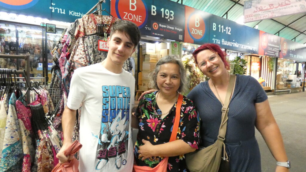 También tuvimos tiempo para hacernos incluso una foto con una señora que tenía un puesto de ropa, y que hablaba muy bien inglés y fue super simpática, estuvimos charlando un buen rato con ella de nuestro itinerario por Tailandia e incluso nos aconsejó varios sitios que visitar. Toda una muestra de la famosa amabilidad tailandesa.